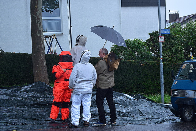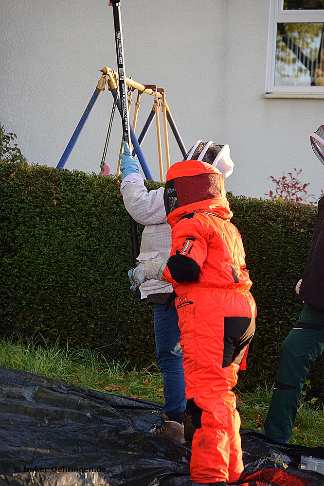 Die um Unterstützung angefragte Hornissenfachberaterin Bianca Duventäster, vom Landesverband Badischer Imker, schulte mehere Imker aus unserem Verein praktisch mit dem Umgang der Velutina-Lanze und so konnten wir gemeinsam das Nest der Hornissen eliminieren. Dies geschieht indem mit Hilfe einer langen Teleskop-Stange mit der Kohlestaub in das Nest eingeblasen wird. Anschließend wurde das Nest entfernt. Bei der Aktion mußte doppelte Schutzkleidung einschließlich Helm mit Visier getragen werden. Da die Hornisse nicht nur sticht, sondern auch Gift versprühen kann wird das Visier benötigt. Starkregen erschwerte die Maßnahme, verhinderte aber auch, daß Beteiligte und Anwohner direkten Kontakt mit den Hornissen hatten.