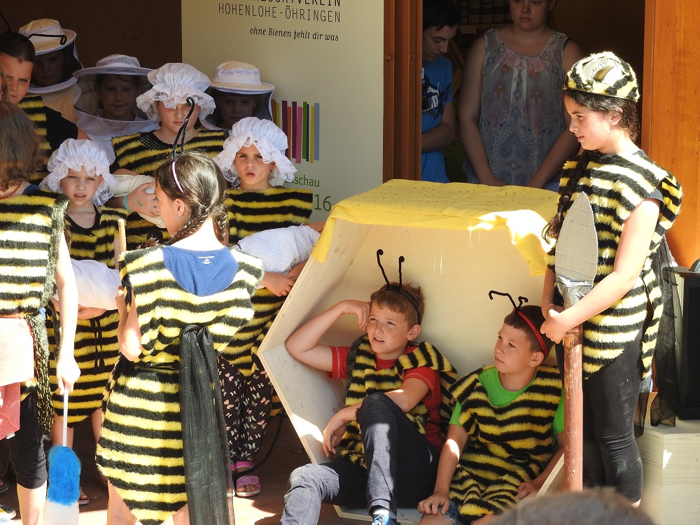 Hoch her ging’s am Imkertag des Wahlkreises 1 auf der Landesgartenschau in Öhringen. Gleich zu Beginn begrüßten die Grundschüler der Pestalozzi-Schule Pfedelbach und der Grundschule Untersteinbach die Besucher mit einem beeindruckenden Bienen-Musical. Imkerin und Grundschullehrerin Susanne Schweizer studierte zusammen mit ihren Kolleginnen Julia Vischer und Susanne Bergdolt eine ergreifende Choreografie ein, welche die Kinder mit Gesang, Tanz und bunten Kostümen zum Leben erweckten. Vom Ei bis zur Königin, von den rumlümmelnden Drohnen bis hin zum Wespenangriff wurde das Leben der Honigbiene besungen und ertanzt. „Hurra, hurra – unsere Königin ist da!“ sangen die Kinder am Ende im Chor und umkreisten ihre Königin immer enger und enger. Für die erstaunten Besucher der Landesgartenschau gab es am Imkerpavillon kein Durchkommen mehr – zu groß war die Menge, die das Musical miterleben wollte, sodass der Weg komplett versperrt war.