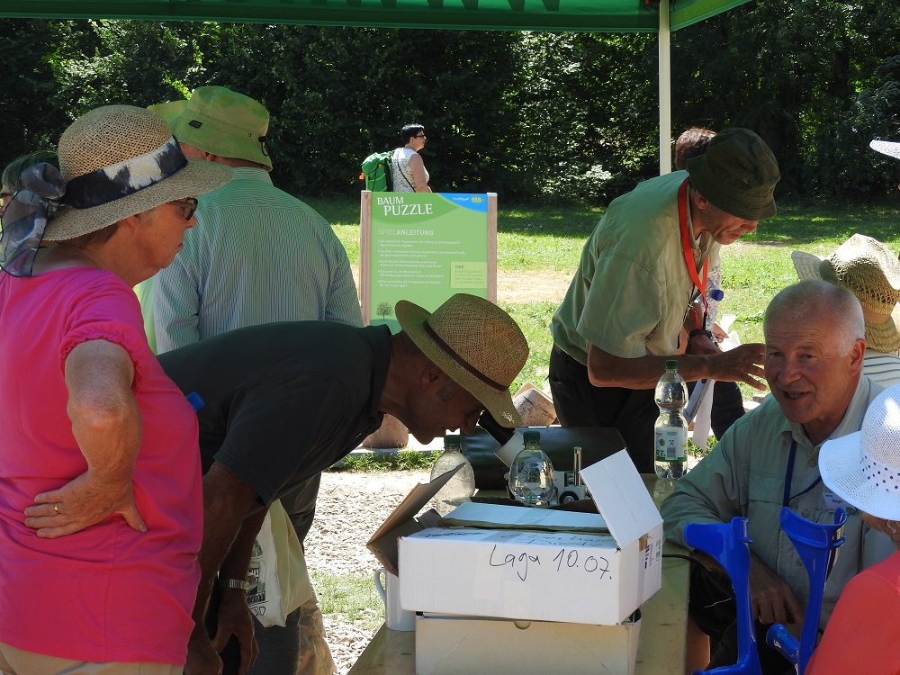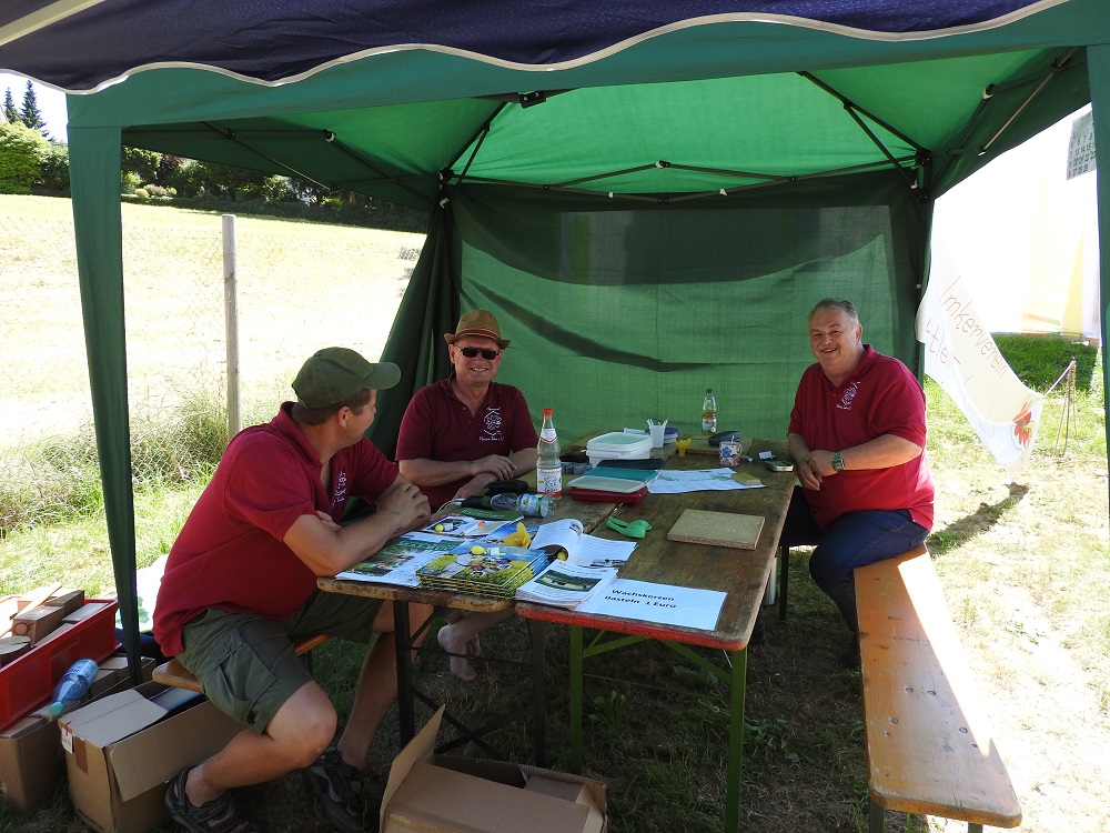 Doch dafür standen neun weitere Attraktionen samt Kaffee, Kuchen und Gebäck parat. So konnte man bei den Gaildorfer Imkern Bienen „live“ im Bienenstock erleben, bei den Schwäbisch Hallern Wachskerzen und Mittelwände herstellen und beim Stand der Mainhardter Imker historische Bienenbeuten bewundern. Viel zu erfahren und sogar noch Preise zu gewinnen gab es bei den Künzelsauern. Einmal am Glücksrad gedreht, und schon hatte man mit etwas Glück einen der vielen Preise ergattert. Für den Imkernachwuchs bot der BV Mittlere Tauber Kerzen wickeln und Nisthölzer bauen an, während Jung und Alt sich bei den Westernhausener handknöcheltief im kühlen Dreck vergruben. Bei ihnen konnte sich jeder Besucher seine eigene „Blumenwiese to go“ kreieren, die er als Samenbombe mit nach Hause nehmen durfte. Viel Fingerspitzengefühl zeigte dagegen die Crailsheimer Heinrich Seiffert und Erich Rothfuß, die das komplizierte Verfahren der künstlichen Königinnenbefruchtung vorführten. Nach den Vorträgen zur gesundheitlichen Heilkraft von Honig, Blütenpollen und Propolis durch die Öhringer Apitherapeutin Rosemarie Bort folgte der nachmittägliche Höhepunkt des Imkertages: Christoph Soter zeigte trotz hochsommerlicher Temperaturen seine ganz besondere Nähe zu den Bienen. Mit Hilfe eines Königinnenpheromon-Halsbandes platzierte er gleich einen ganzen Schwarm Bienen auf seinem Körper und lud zu einem Stelldichein mit dem Bienenmann. Imker Jürgen Deuser überwand als erster die Hemmungen und zeigte, wie sanftmütig unsere Honigbienen doch sind. Nach ihm setzten sich noch zahlreiche Besucher ebenfalls auf die Bank, um sich bei ihrem Rendezvous mit dem Bienenmann fotografieren zu lassen und unvergessliche Momente mit nach Hause zu nehmen.
