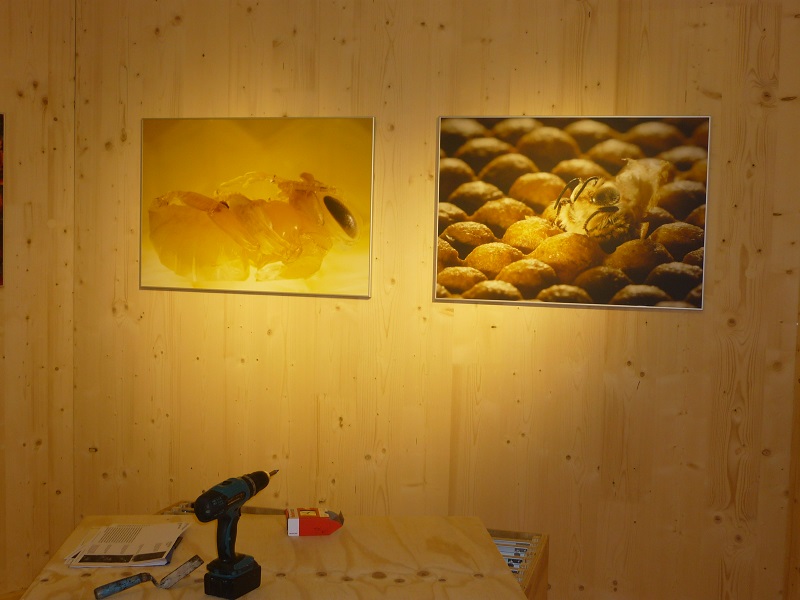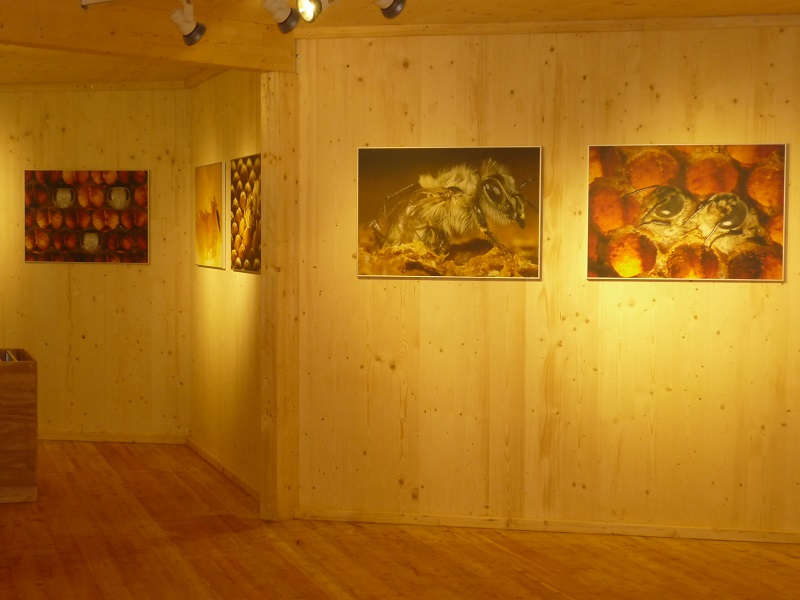 Am Samstag, 30. April war es so weit: Die Ausstellung wurde im Imkerpavillon eröffnet. Allen Beteiligten, die bis zum letzten Augenblick gewerkelt hatten, fiel eine Last vom Herzen, und alle konnten das warme Licht in der hölzernen Wabe genießen. Vor allem aber die detailgenauen Bilder: Das Portrait einer Arbeiterin, die gerade in einer Blüte sitzt und vom Goldstaub der Pollen überpudert ist; eine Pollensammlerin von hinten, die breitbeinig das Gewicht der dicken Pollenknödel an ihren Hinterbeinen austarieren muss; wie Sterne segeln die anfliegenden Bienen vor dem Flugloch; oder die Biene, die gerade zur Hälfte in der Zelle steckt und sich vom Putzen nicht abbringen lässt. Diese und viele andere Bilder sind zu sehen, unter denen der Bienenliebhaber bestimmt sein Lieblingsbild findet und der Laie wie der Fachmann aus dem Staunen nicht herauskommen.